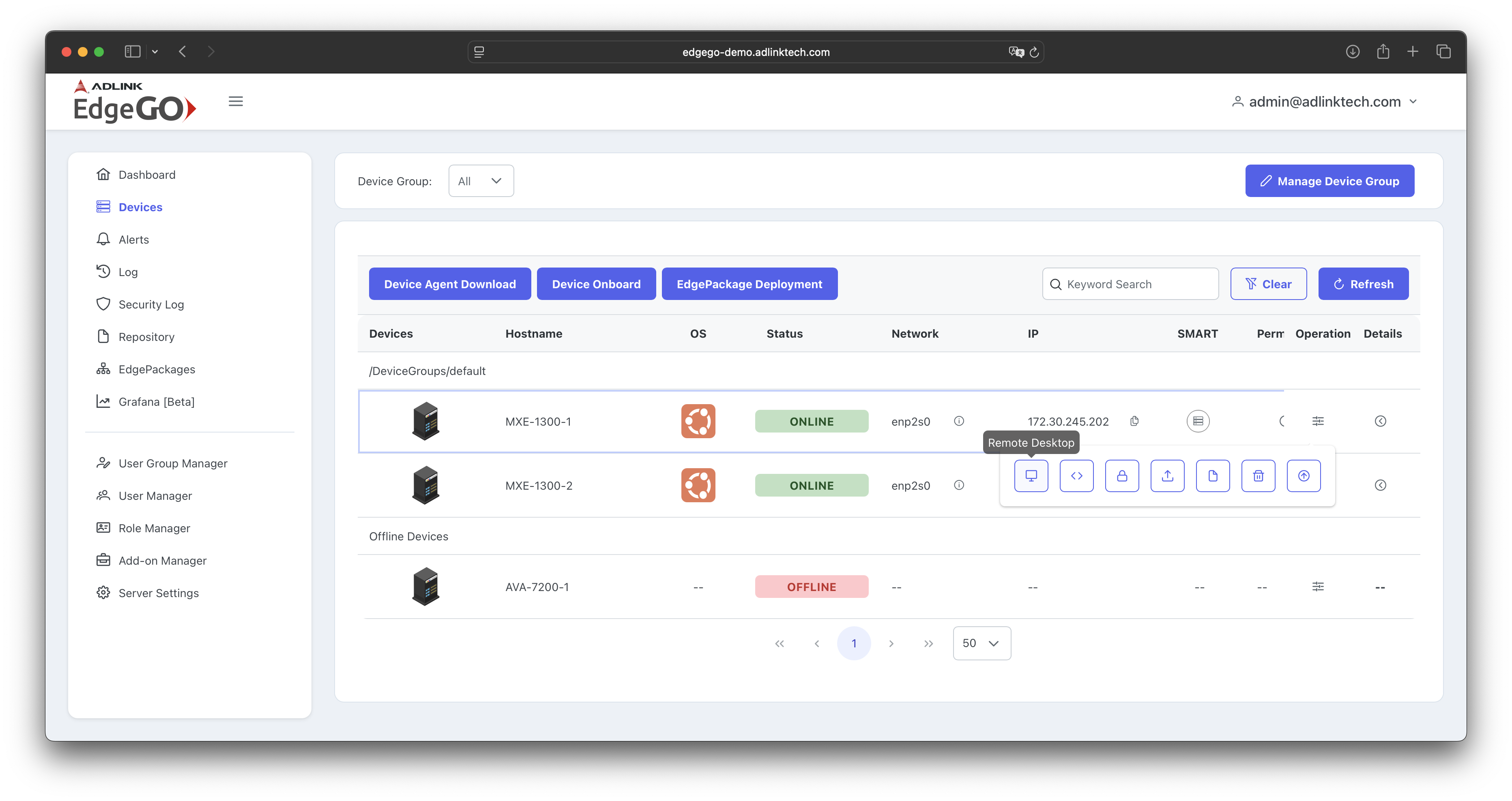 Remote Desktop allows you to securely connect to your managed device’s graphical desktop environment directly through the EdgeGO web interface, providing full visual access to device screens without requiring separate VNC clients or physical device access.